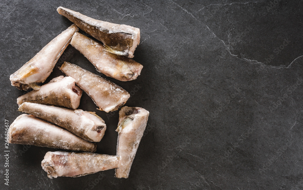 Frozen fillet fishes on slate stone background. Seafood, top view, flat lay, copy space