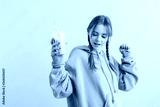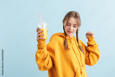 Young attractive girl with two braids in orange hoodie holding plastic cup with juice in hand while dreamily dancing over blue background