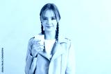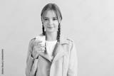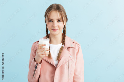 Young beautiful girl with two braids in pink leather jacket and white t-shirt holding glass with milk in hand while happily looking in camera over blue background