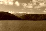 Forest covered mountains and lake in foreground