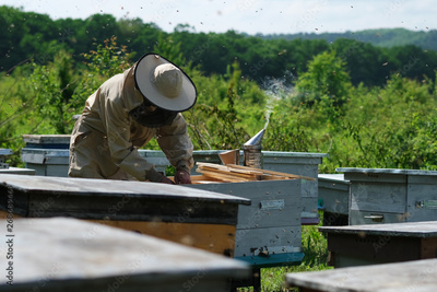 Beekeeper working collect honey. Apiary. Beekeeping concept.