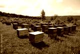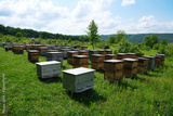 Apiary. Hives in an apiary with bees flying to the landing boards. Apiculture.