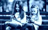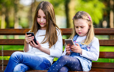 Two little girls having fun with smartphones in the park. Lifestyle, technology concept