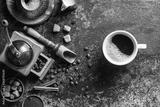 Coffee cup with coffee grinder and coffee beans on dark textured background.