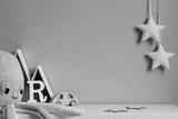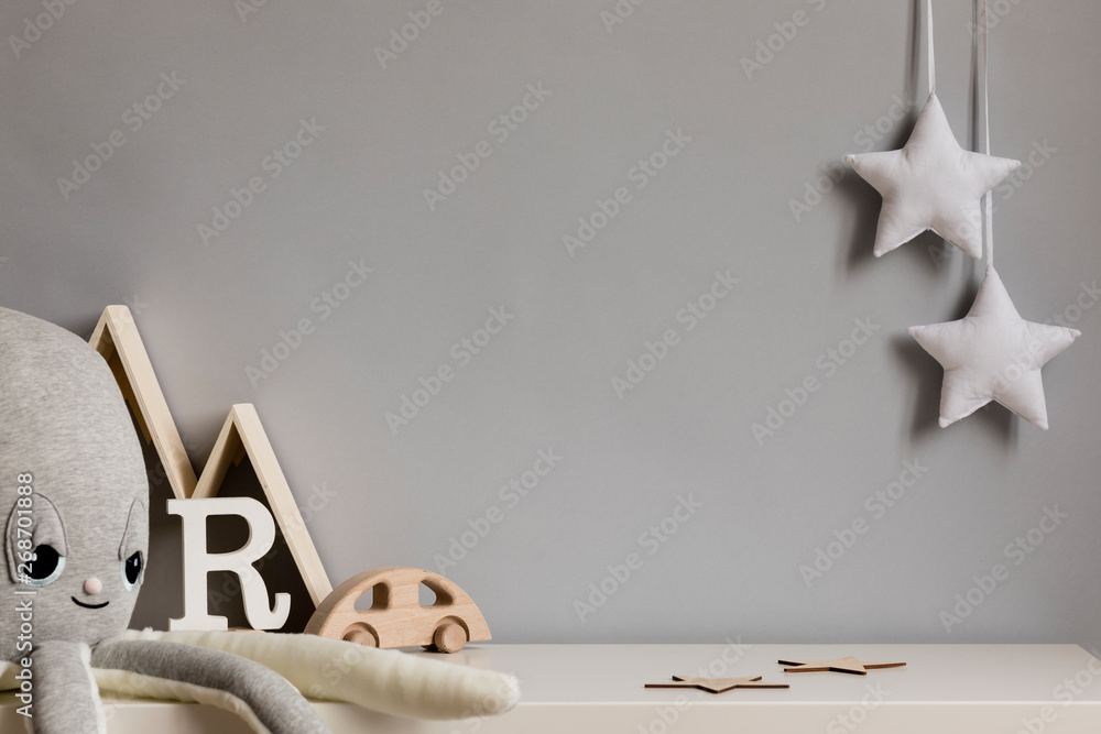 Stylish and cozy childroom with plush octopus, wooden mountain box, car and hanging white stars on the gray wall. Bright and sunny interior. Copy space. Minimalistic childish decor. Template.