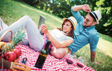 Couple enjoying picnic together. Love and tenderness, dating, romance, lifestyle concept