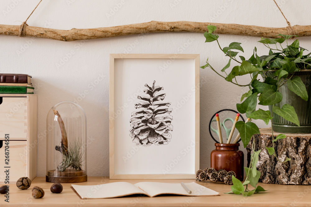 Stylish and scandinavian interior of living room with mock up poster frame, wooden accessories, organizer, books, forest cones, plants and personal stuff. Minimalistic and botanical home decor.
