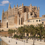 End view of the famous gothic cathedral Santa Maria La Seu with palm tree garden in the foreground