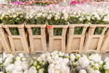 Warehouse refrigerator, Wholesale flowers for flower shops. White peonies in a plastic container or bucket. Online store. Floral shop and delivery concept.
