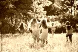 Large group of kids, friends boys and girls running in the park on sunny summer day in casual clothes .