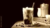 Ice coffee in a tall glass with cream poured over, ice cubes and beans on a old rustic wooden table. Cold summer drink with tubes on a black background with copy space