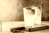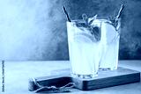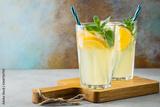Two glass with lemonade or mojito cocktail with lemon and mint, cold refreshing drink or beverage with ice on rustic blue background. Copy space