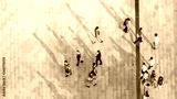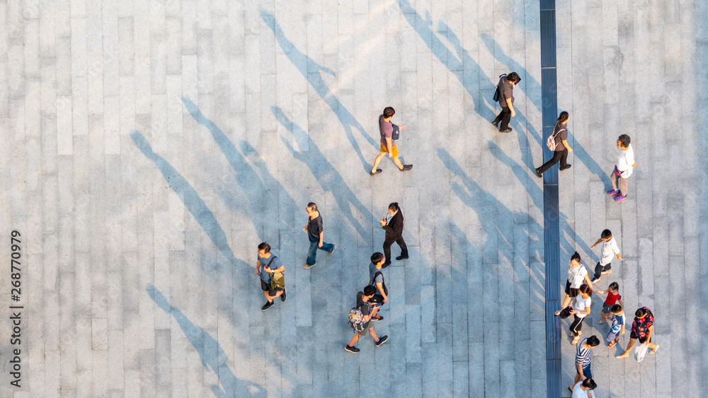 group of people walk on across the pedestrian concrete landscape in the city street (Aerial top view)