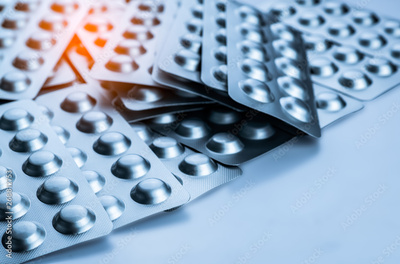 Painkiller and muscle relaxant medicine. Pile of silver aluminium foil blister pack. Pharmaceutics and pharmaceutical industry concept. Drug use in hospital. Global healthcare. Pharmacy background.