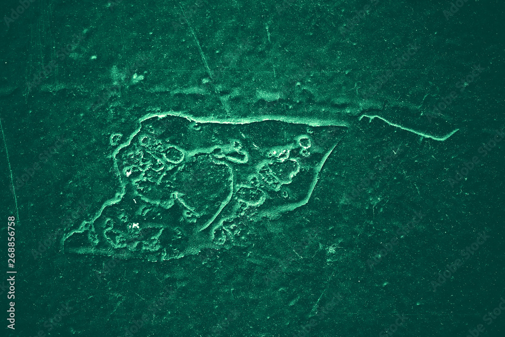 Vintage green background. Rough painted wall of emerald color. Imperfect plane of virid colored. Uneven old decorative toned backdrop of green tint. Texture of emerald hue. Ornamental stony surface.