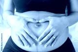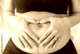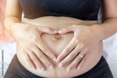 Beautiful pregnant woman make symbol of love and touching on her belly. Pregnant girl has the first child of family. She love her baby so much and always care about her health. She nearly give birth