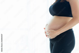 Beautiful pregnant woman holding belly by using hands. Attractive beautiful pregnant girl or mom love baby so much. Charming beautiful young mother look after herself very well. She wear sport wear
