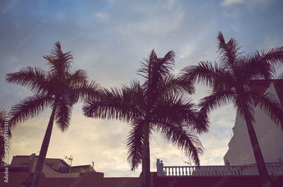 Looking up at palms silhouettes at sunset, color toned picture, Tenerife, Spain.
