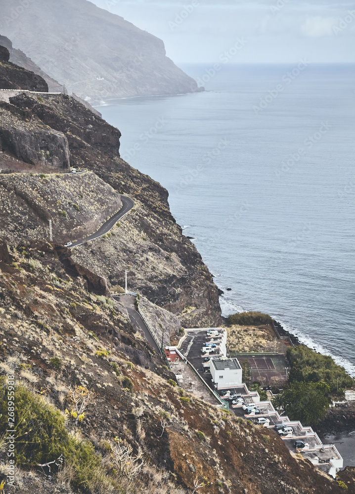 Vintage toned picture of Tenerife mountainous coast on a cloudy day, Spain.