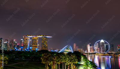 SINGAPORE-MAY 18, 2019 : Cityscape Singapore modern and financial city in Asia. Marina bay landmark of Singapore. Night landscape of business building and hotel. Panorama view of Marina bay at dusk.