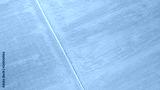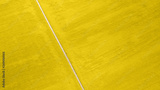 aerial view of rapeseed field and rural road in the middle. natural yellow spring summer background. drone shot. Farmland from above