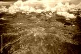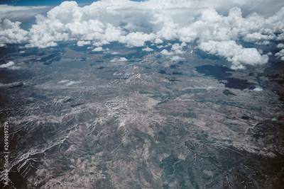Aerial mountains under clouds map view. Airplane view middle east landscape