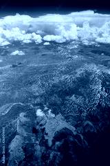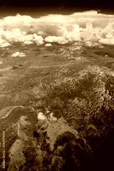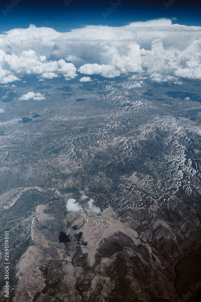 Aerial mountains and clouds top view vertical. Airplane view middle east landscape