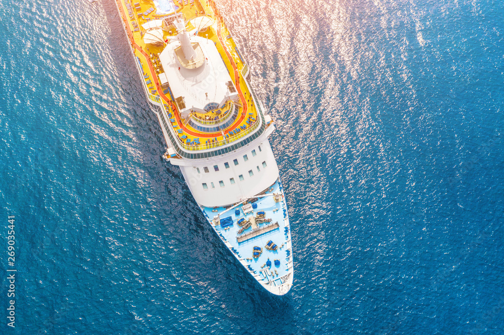 Nose of the cruise ship in the turquoise sea, with a glare from the sun on the water. Concept of summer sea cruise tours.