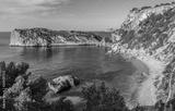 A beautiful rocky bay on the Mediterranean north of the city of Moraira on a sunny day with blue sky and turquoise water.