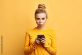 angry sad woman with hairbun annoyed by something while using phone, girl has received bad sms, text message isolated yellow background. emotion, reaction, feeling