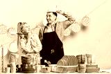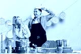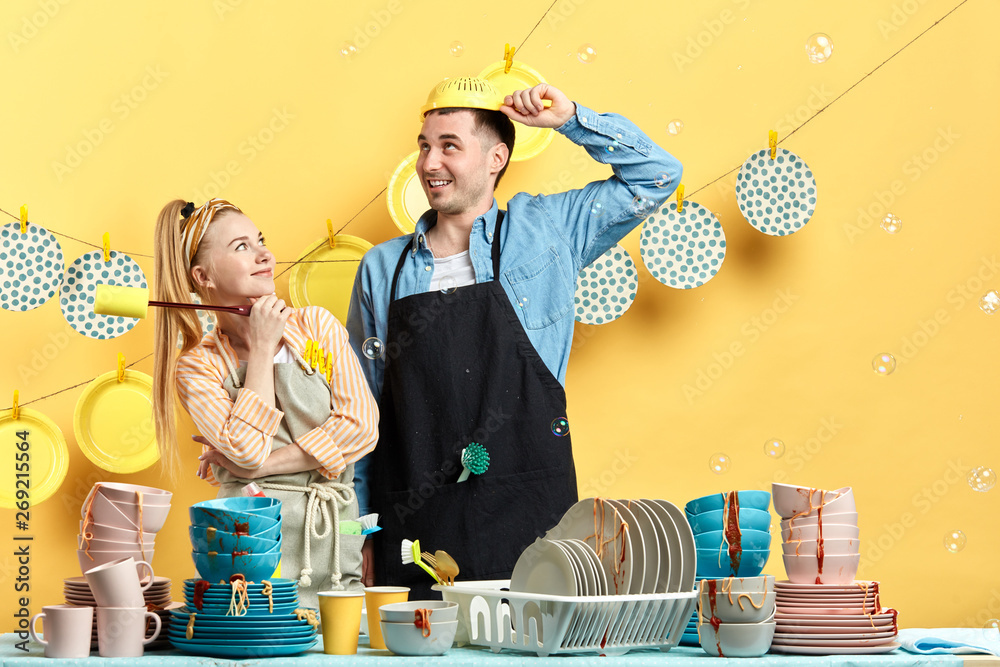 crazy positive man putting on the colander while his pensive smiling wife holding a washing tool and watching him, close up photo. studio shot.