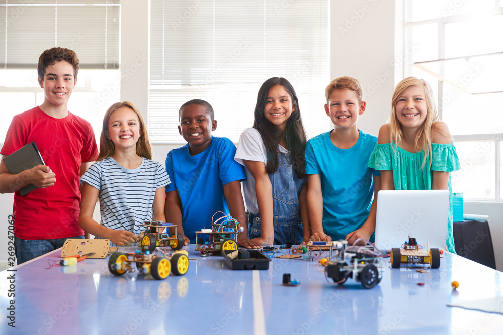 Portrait Of Male And Female Students Building Robot Vehicle In After School Computer Coding Class