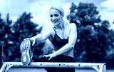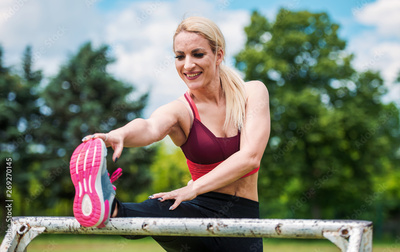Stretching exercises. Young woman doing fitness outdoors. Sport and recreation concept