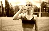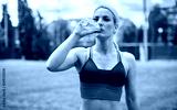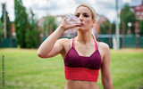 Jogging. Young woman drinking water after training outdoors. Fitness, sport, lifestyle concept