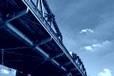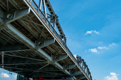 Steel bridge structure against blue sky and white clouds. Iron bridge engineering construction. Strong and strength metal bridge. Road bridge architecture. Infrastructure.