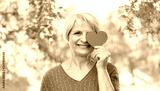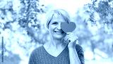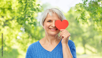 valentine's day, summer and old people concept - portrait of smiling senior woman covering one eye with red heart over green natural background