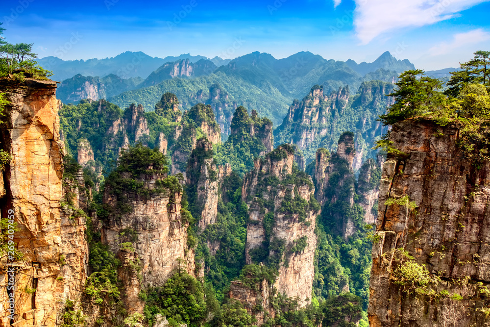 Zhangjiajie National Forest Park. Gigantic quartz pillar mountains rising from the canyon during summer sunny day. Hunan, China.