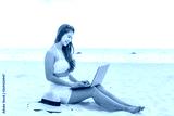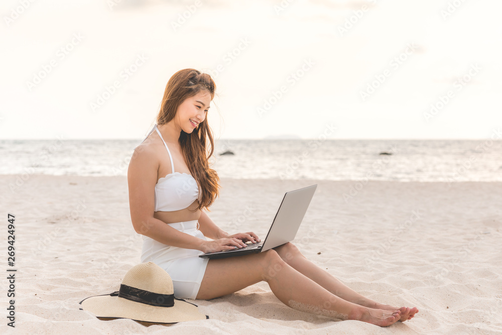 Cute Asian woman working with computer laptop on the tropical island beach with sunset feeling so happiness and comfortable,Summer Vacations and Freelance concept