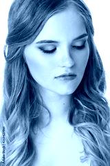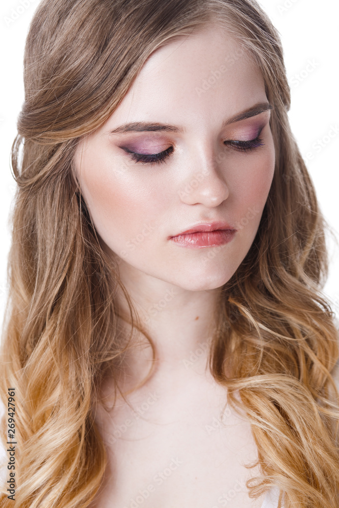 close-up of a positive young woman bride with professional wedding makeup pastel colors and hair styling curls.