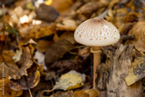beautiful flat-headed mushroom grows in the autumn forest on the background of yellow leaves