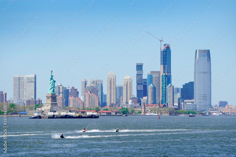 Panorama view of The Statue of Liberty in foreground and New York City skyscrapers in background, Boats in river with blue sky.