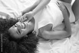 Beautiful afro girl with charming smile lying on the bed.