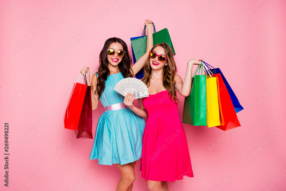 Close up photo two people beautiful she her ladies low prices carry many packs friendly mood 100 hundred bucks wear sun specs summer colorful dresses formal-wear isolated pink bright background