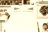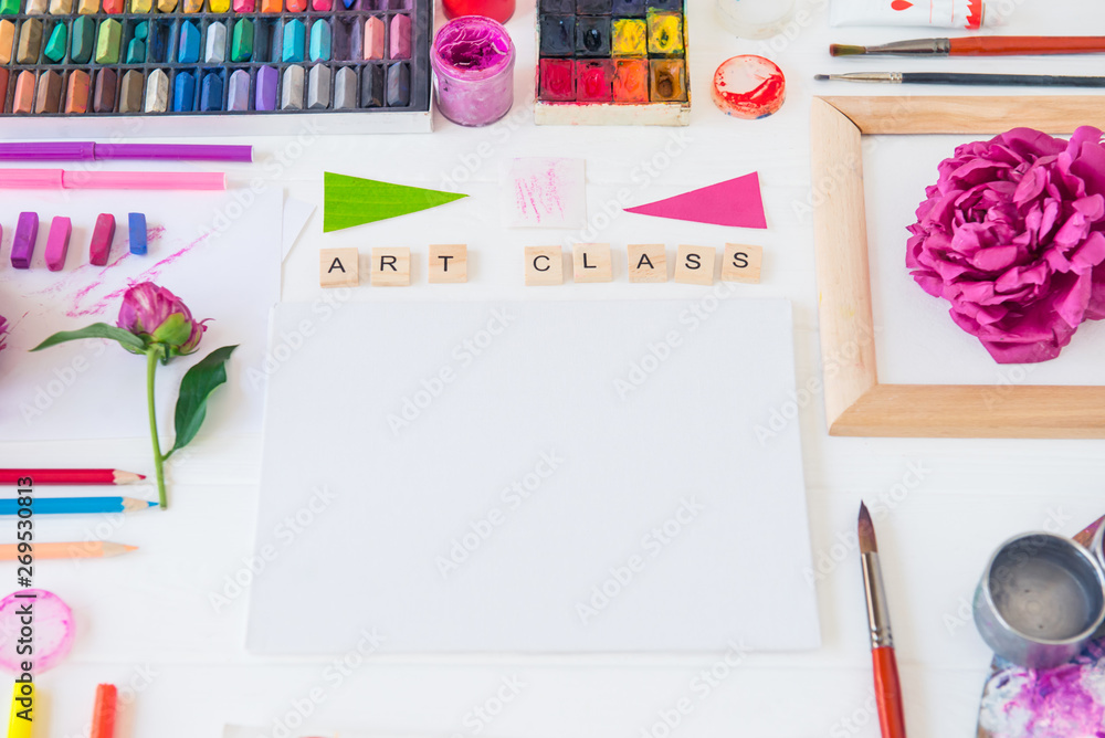 Top view creative artist workplace. Blank Canvas, Art class lettering on wooden blocks and various colorful painting materials and flowers on white background.Art therapy, Drawing lessons. Flat lay.