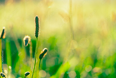 Green grass flower in the early morning in garden with sunshine. Green grass field with bokeh background in spring season. Nature background. Clean environment. Fresh air. Gentle and mild concept.