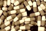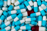 Bulk blue-white and red-white capsule pills. Contaminate in production line of pharmaceutical manufacturing. Drug interaction concept. Pharmaceutical industry. Pharmacy product background. Healthcare.