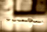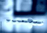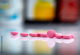 Pink tablets pills on blurred background of drug bottle in drugstore or pharmacy department in hospital. Pharmaceutical industry. Pharmaceutics concept. Medicine for treatment illness. Healthcare.