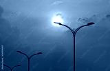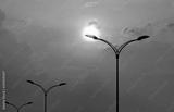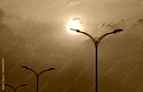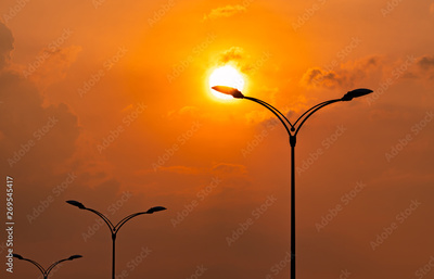 Silhouette street electric pole with beautiful orange and yellow sunset sky and clouds in the evening. Street lamp light. City road lamp post for illumination Power and energy conservation concept.