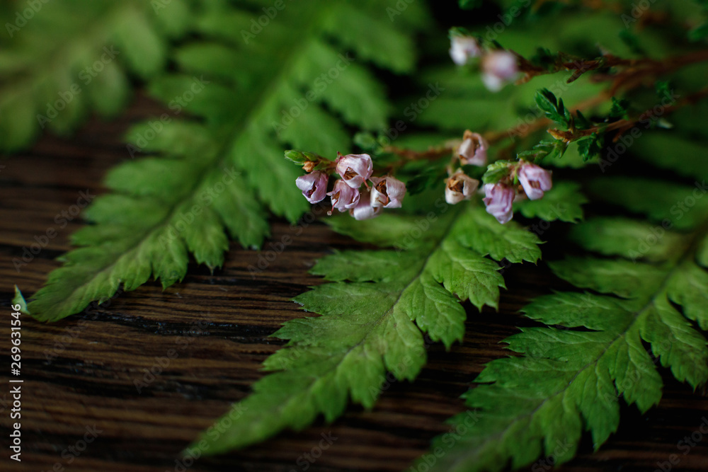 heap sprig lies on a sheet of fern. soft focus
