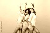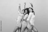 Glamorous hispanic woman in yellow shirt enjoying funny dance with friends. Indoor portrait of three cheerful girls chilling during photoshoot.